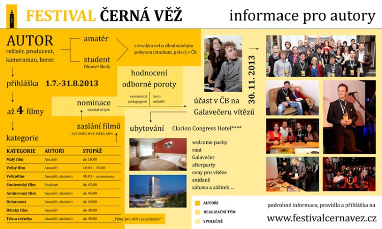 ČERNÁ VĚŽ se připravuje a vy už můžete přihlašovat své amatérské a studentské filmy. Letos nově do osmi kategorií. Přihlášky jsou otevřeny do 31. 8. 2013. Využijte jedinečnou příležitost prezentovat svou tvorbu a v případě úspěchu se můžete těšit na nezapomenutelný zážitek v srdci Jižních Čech. Filmy můžete přihlásit