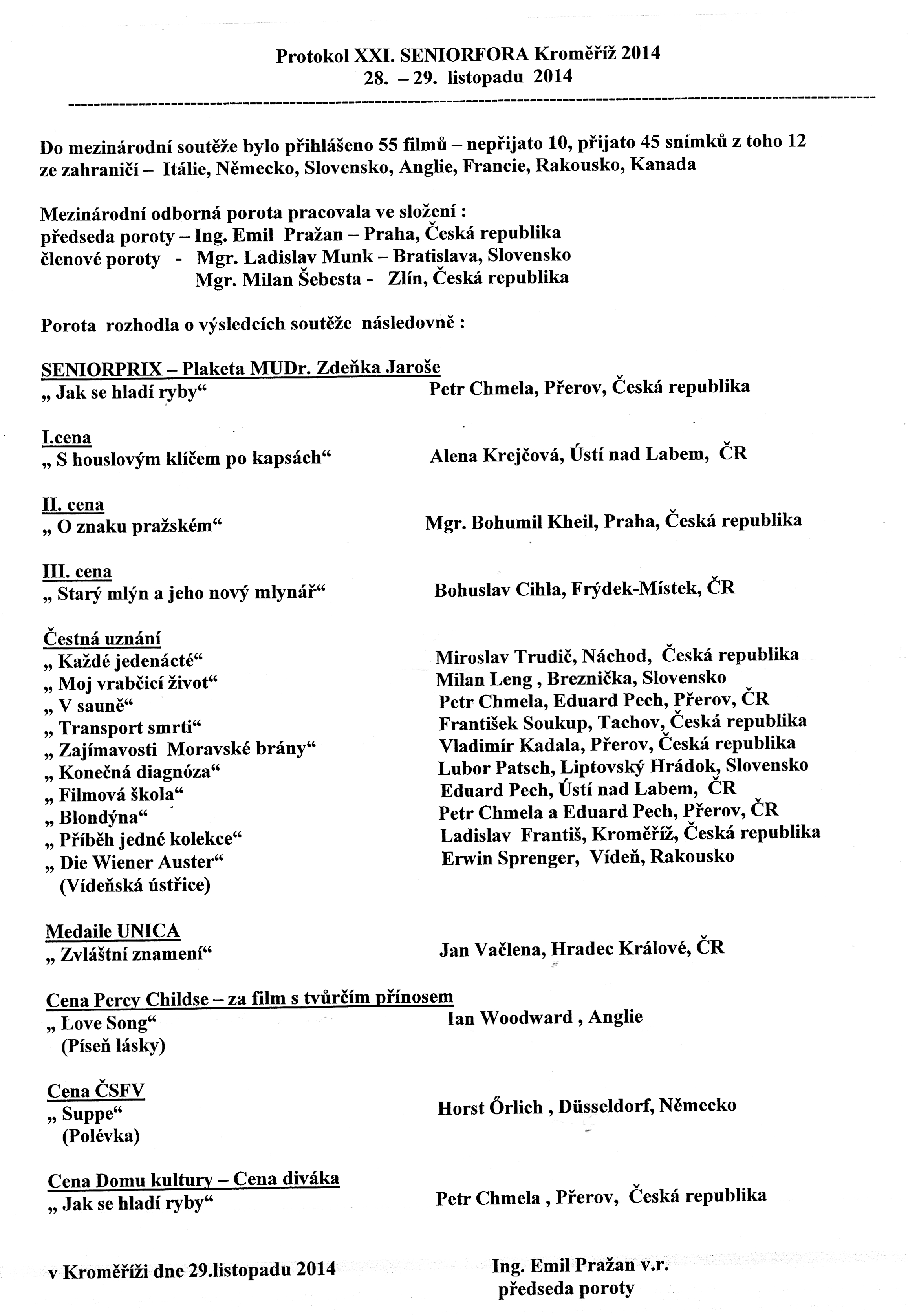 Benátky filmových amatérů 2014 - Výsledky