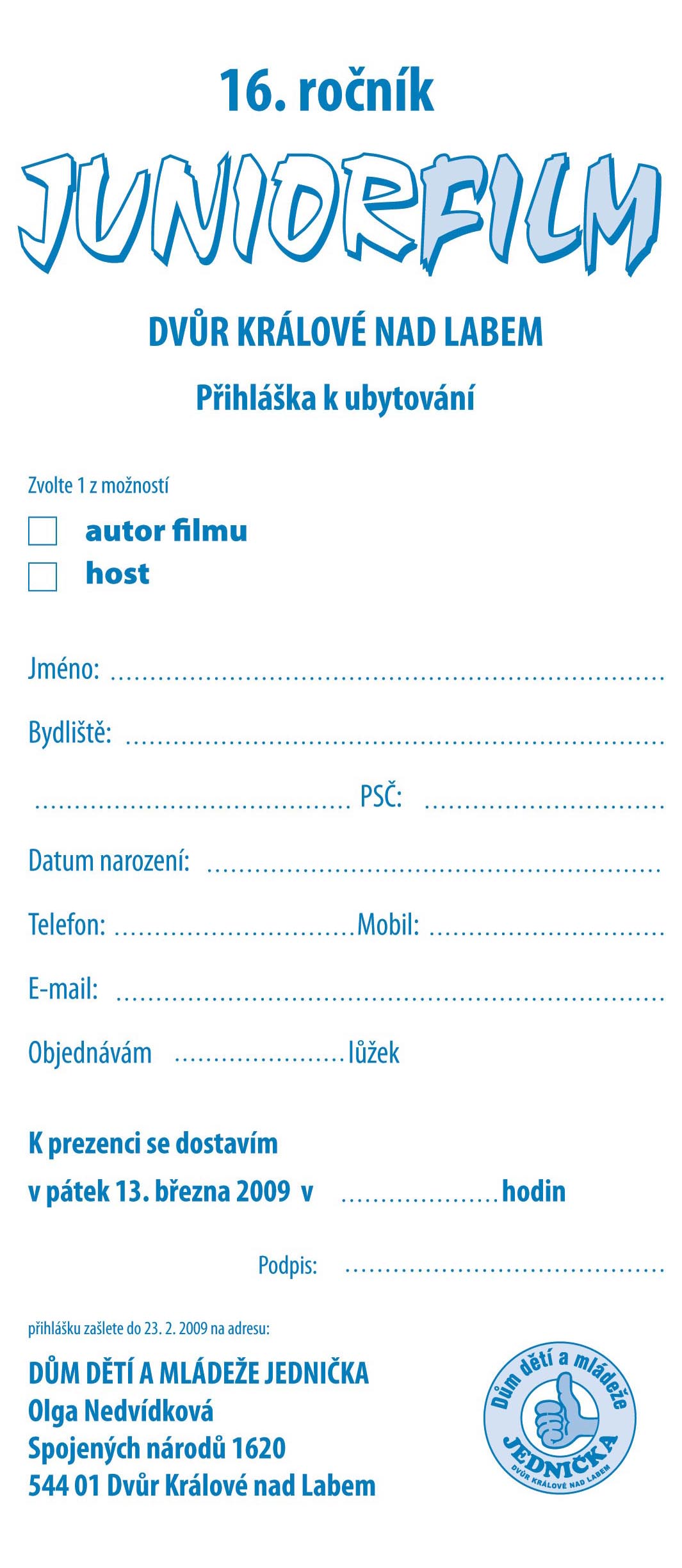 Juniorfilm 2009 - Přihláška ubytování